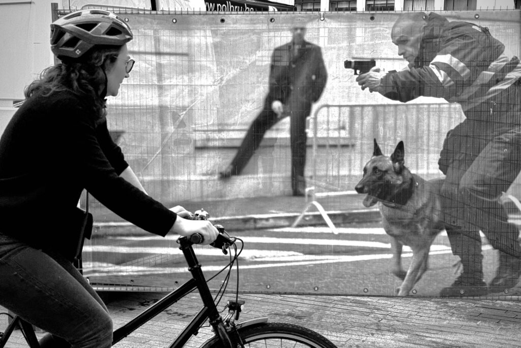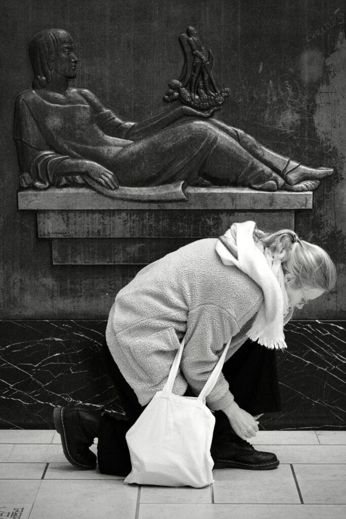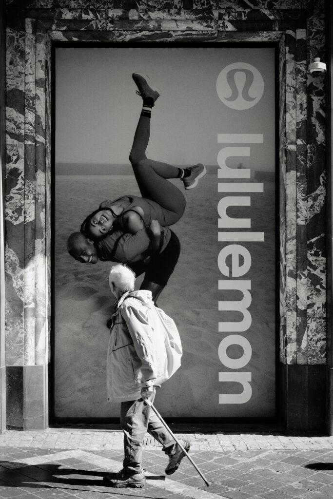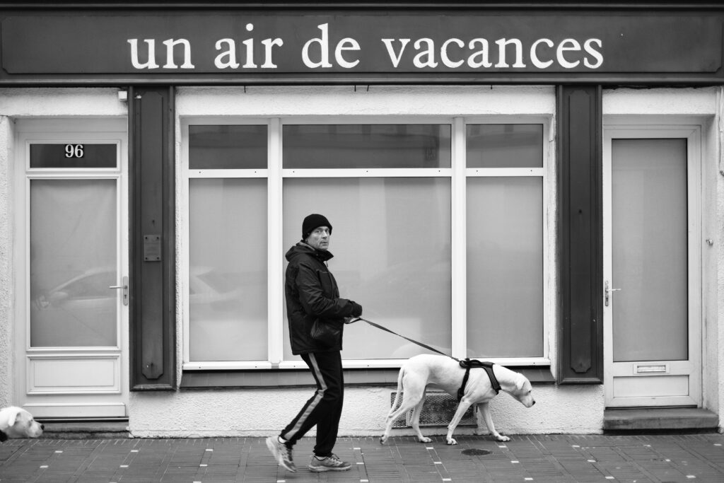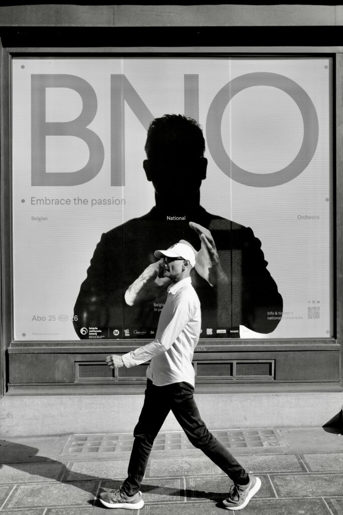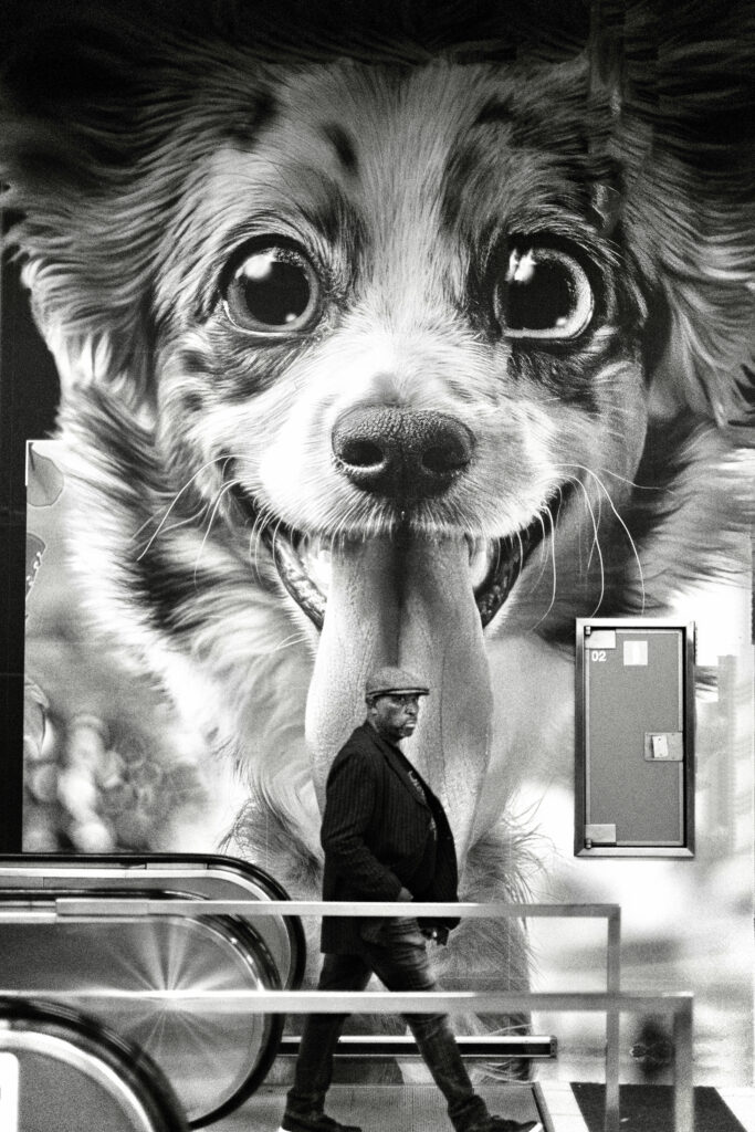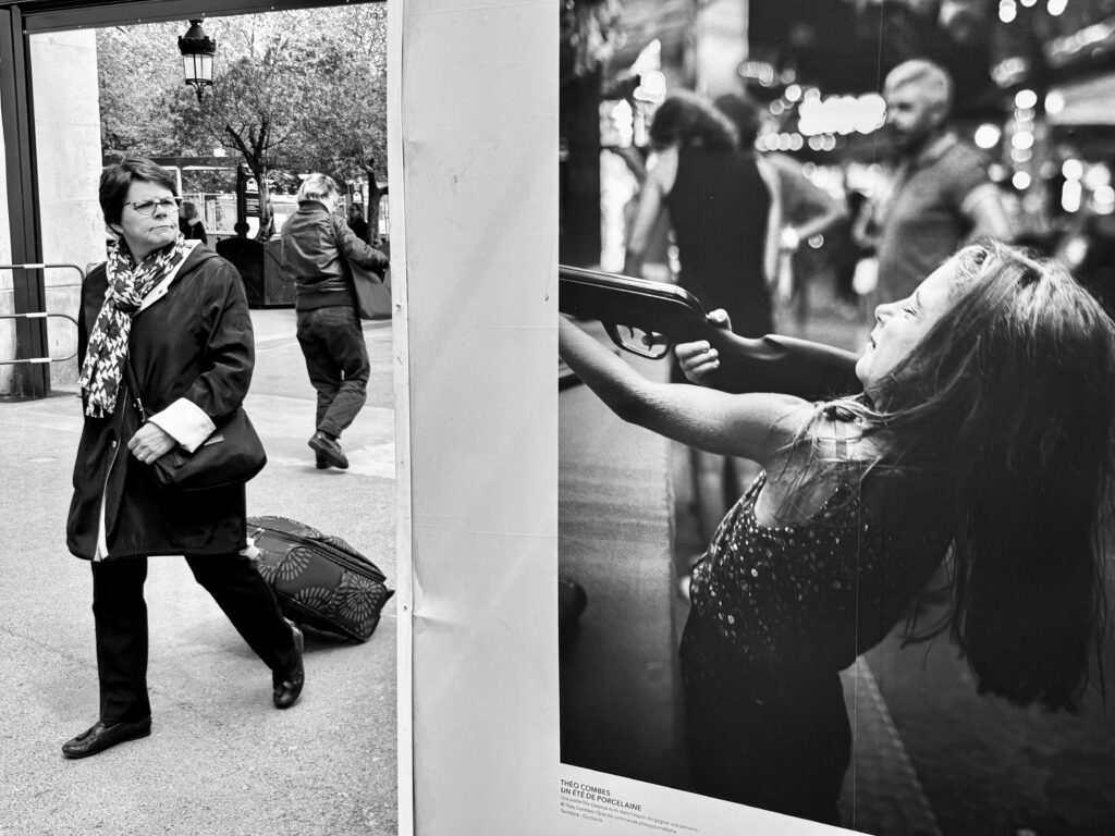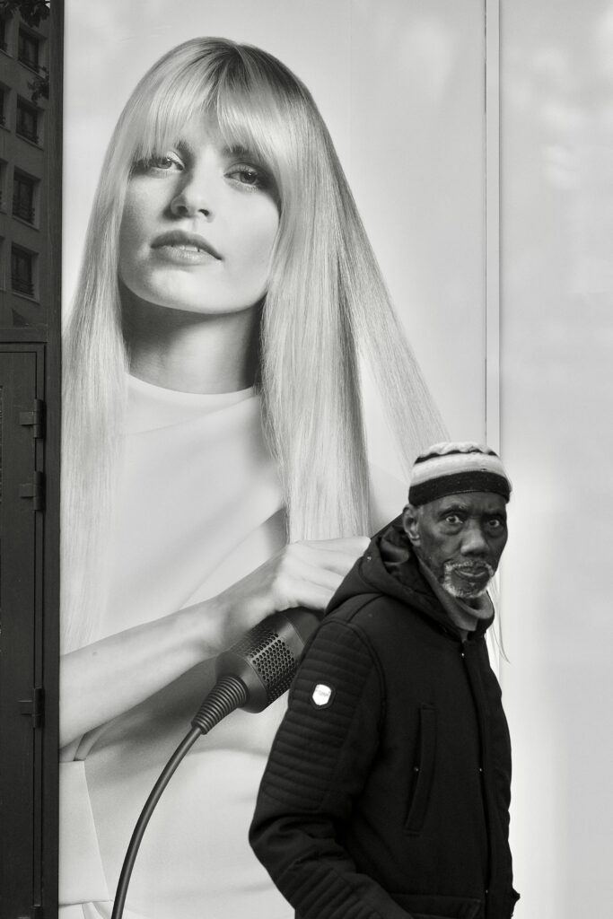 Ma pratique de la photo s’est ensuite naturellement prolongée dans la rue, où l’imprévu dicte désormais directement le sens né de l’addition d’un sujet et de son arrière-plan. Je cherche à y repérer toute association intéressante entre les personnes qui croisent mon objectif – personnes qui deviennent instantanément des personnages – et un élément du décor urbain qui les entoure. Ainsi naissent autant d’histoires visuelles interpellantes ou simplement émouvantes. Et si j’y glisse souvent une touche d’humour, de malice, voire une pointe de cynisme, c’est toujours avec bienveillance. J’aime les gens et le contact.