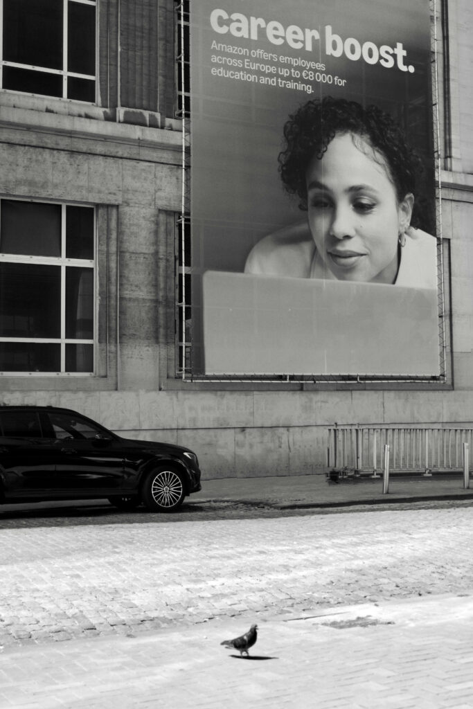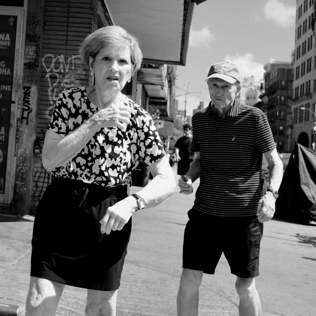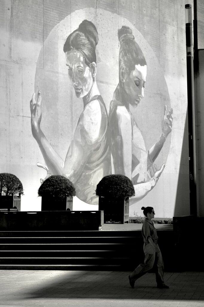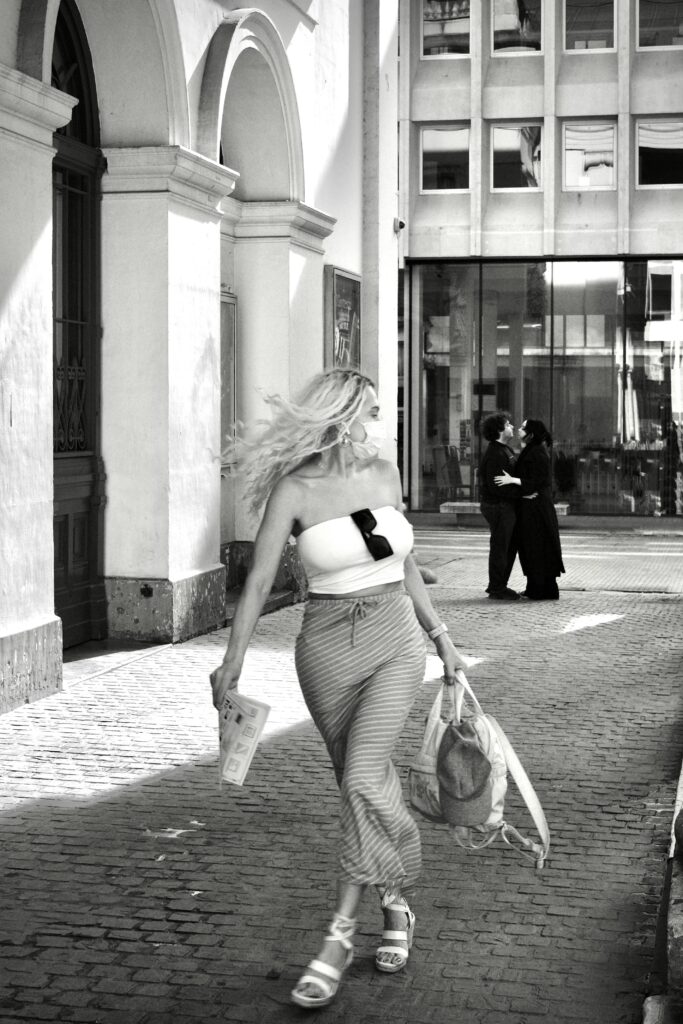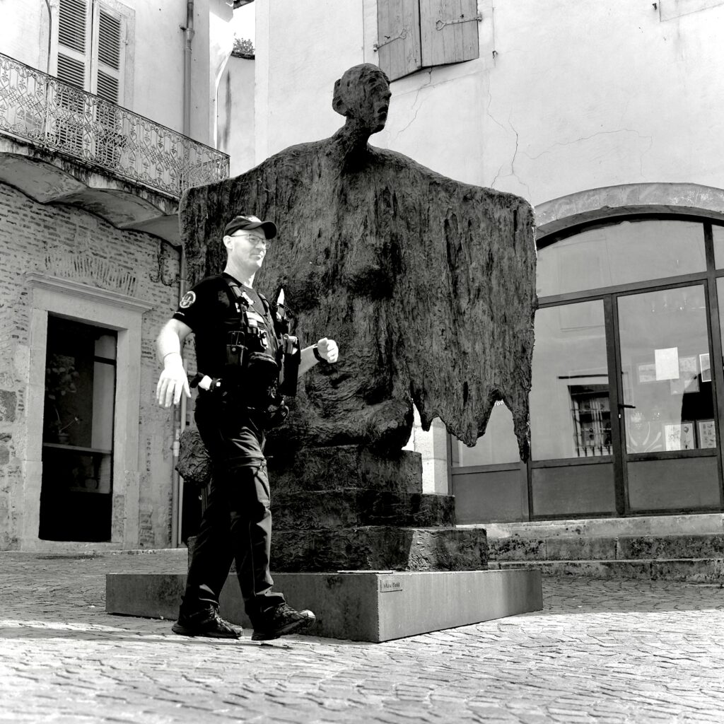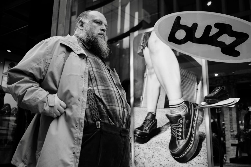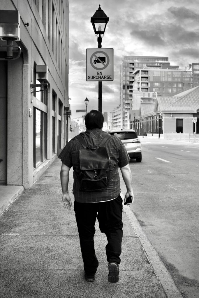 Ma pratique de la photo s’est ensuite naturellement prolongée dans la rue, où l’imprévu dicte désormais directement le sens né de l’addition d’un sujet et de son arrière-plan. Je cherche à y repérer toute association intéressante entre les personnes qui croisent mon objectif – personnes qui deviennent instantanément des personnages – et un élément du décor urbain qui les entoure. Ainsi naissent autant d’histoires visuelles interpellantes ou simplement émouvantes. Et si j’y glisse souvent une touche d’humour, de malice, voire une pointe de cynisme, c’est toujours avec bienveillance. J’aime les gens et le contact.