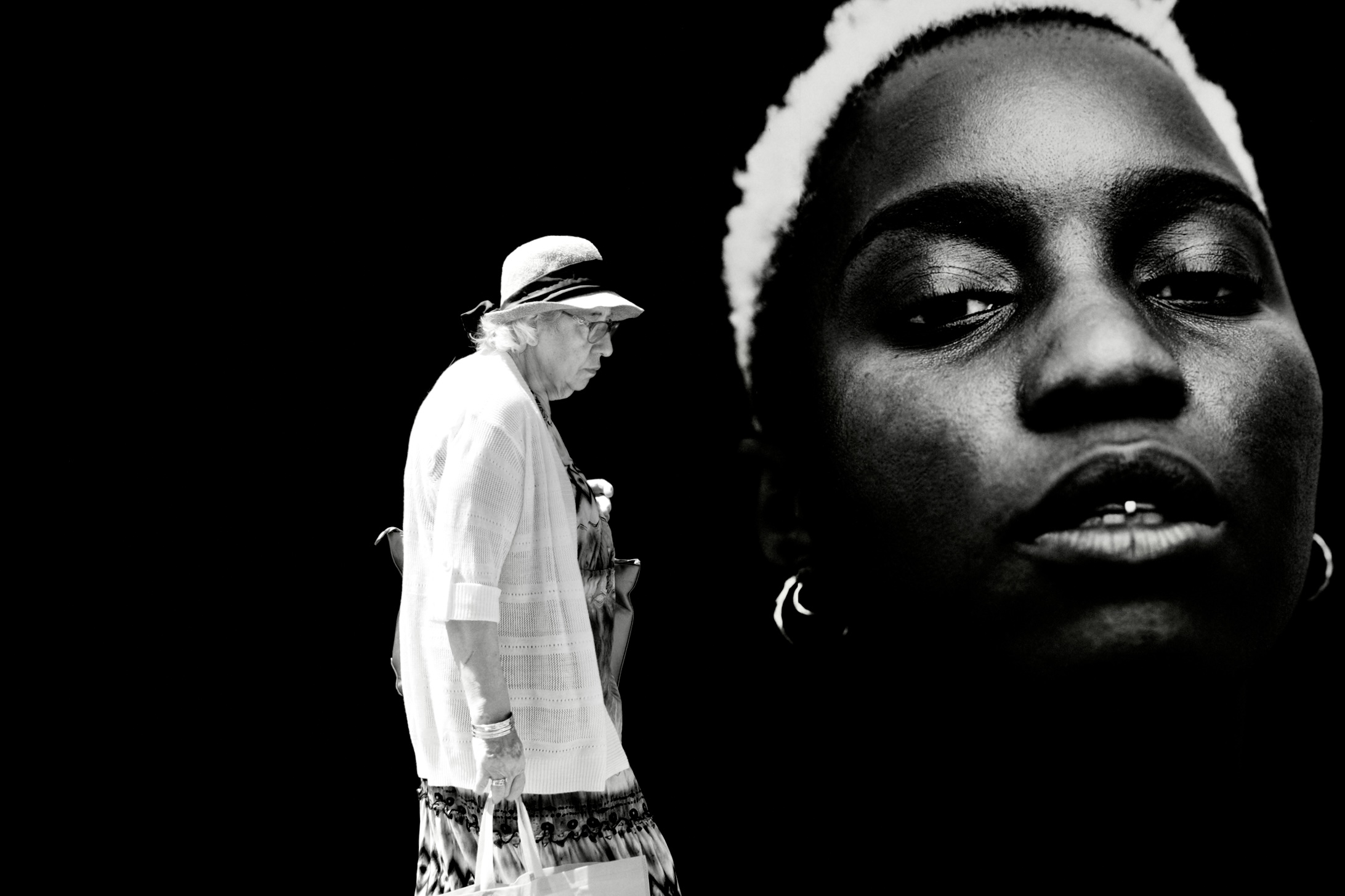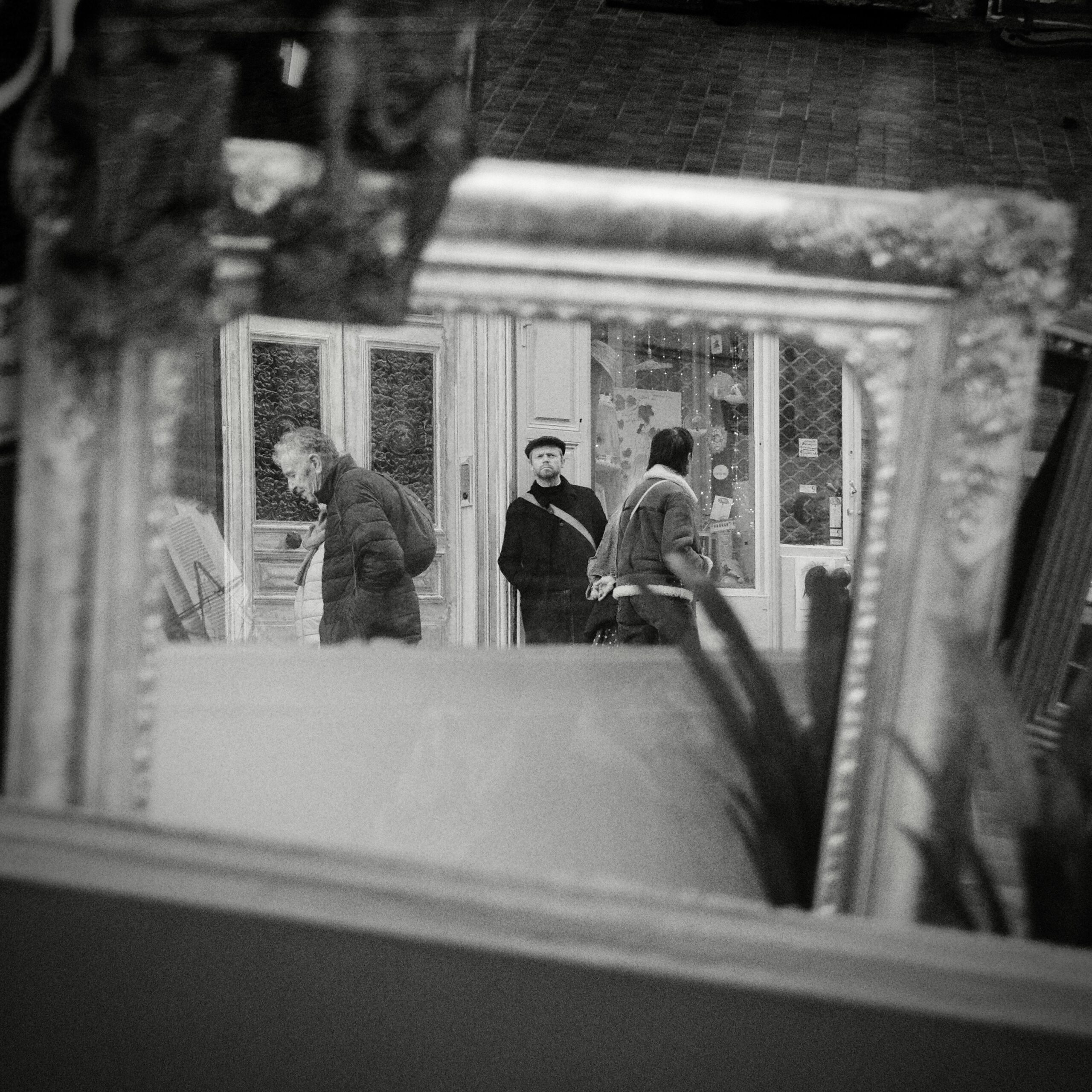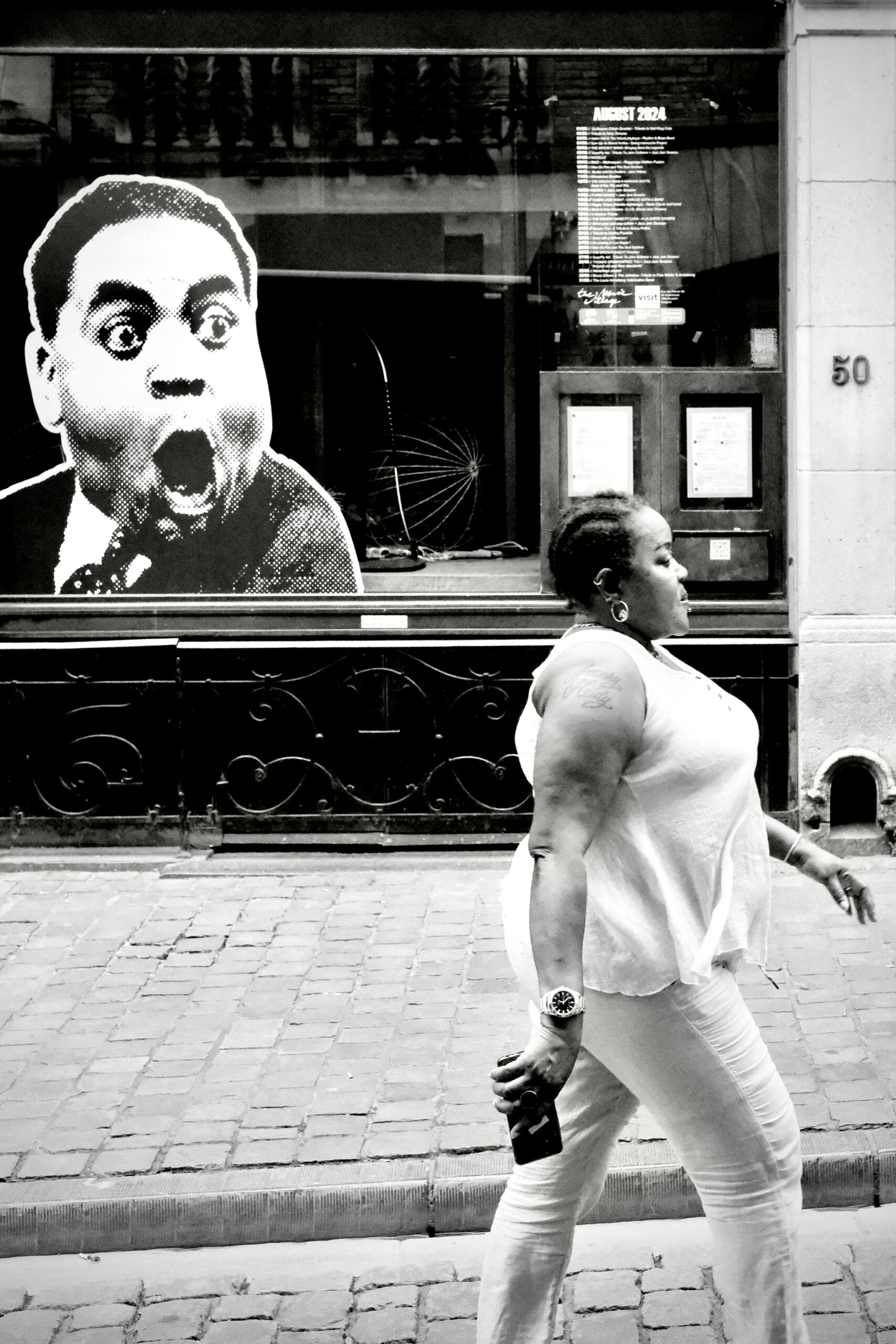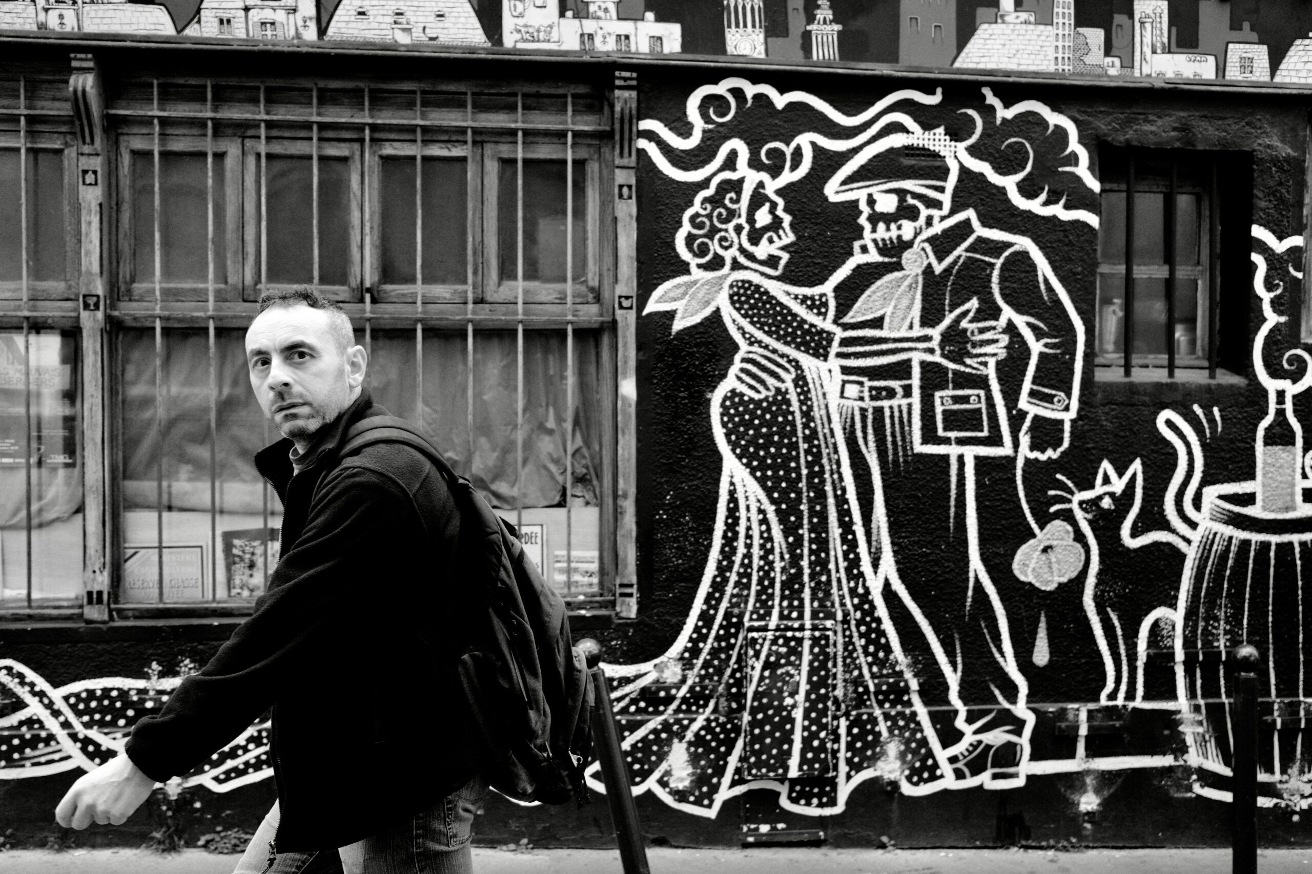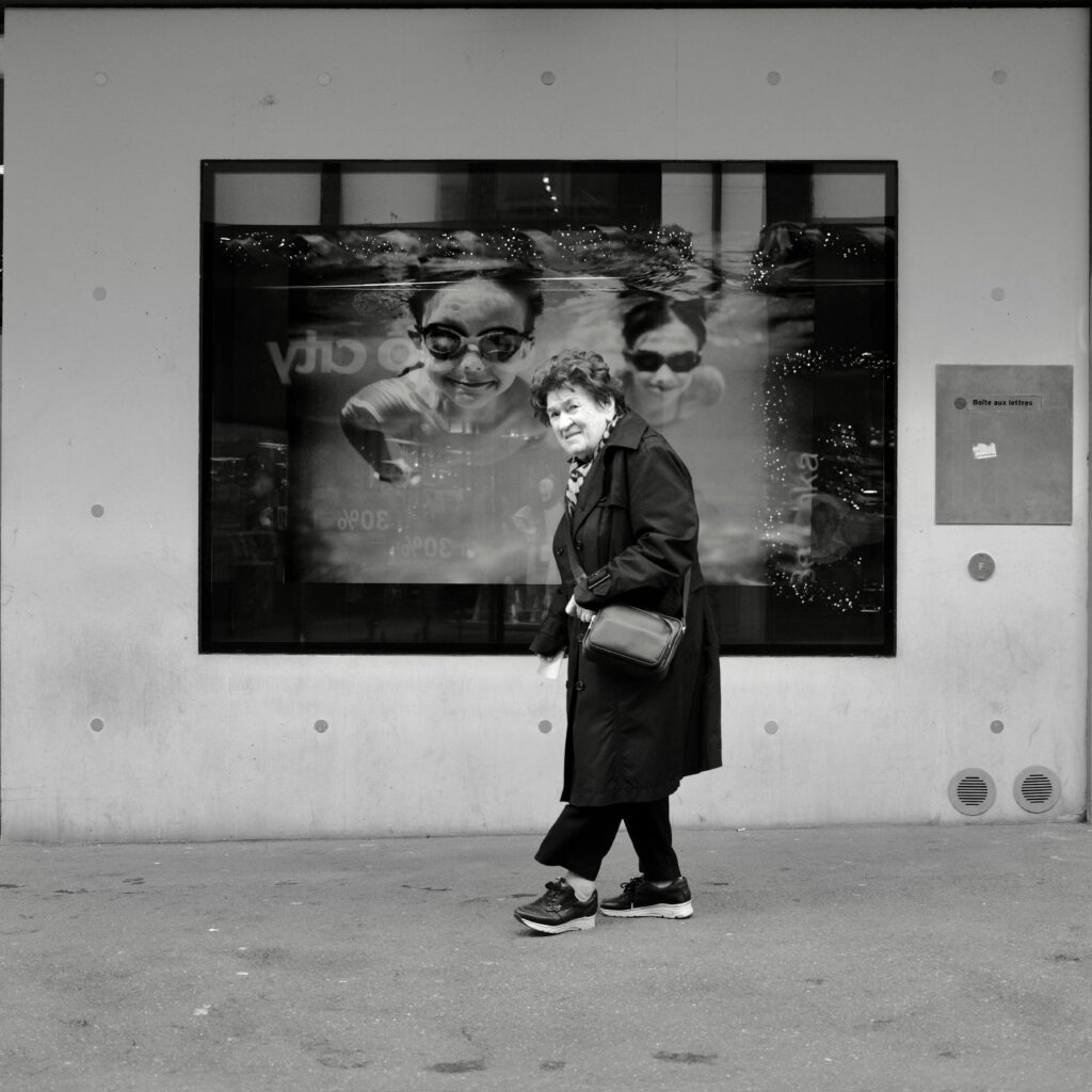Ma pratique de la photo s’est ensuite naturellement prolongée dans la rue, où l’imprévu dicte désormais directement le sens né de l’addition d’un sujet et de son arrière-plan. Je cherche à y repérer toute association intéressante entre les personnes qui croisent mon objectif – personnes qui deviennent instantanément des personnages – et un élément du décor urbain qui les entoure. Ainsi naissent autant d’histoires visuelles interpellantes ou simplement émouvantes. Et si j’y glisse souvent une touche d’humour, de malice, voire une pointe de cynisme, c’est toujours avec bienveillance. J’aime les gens et le contact.