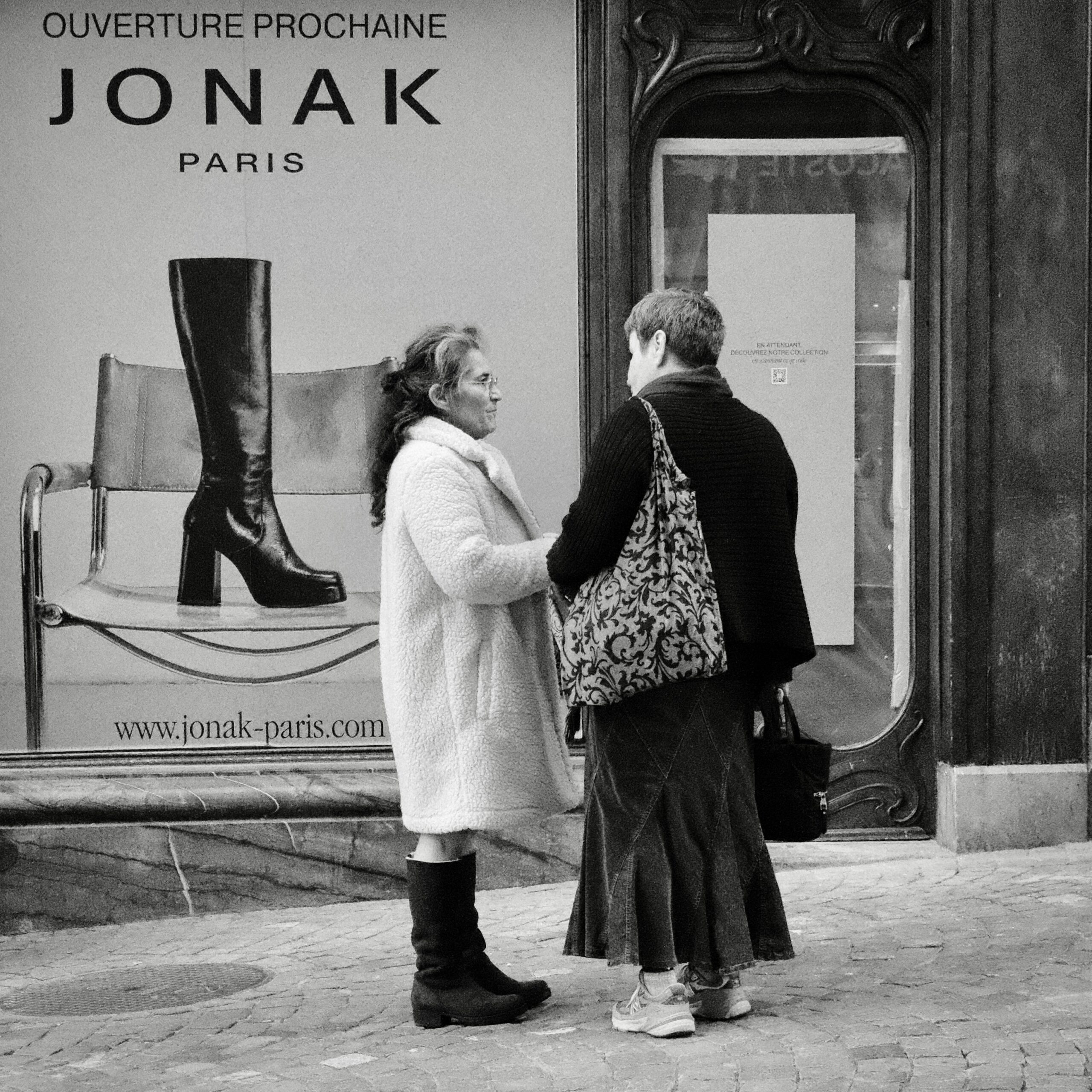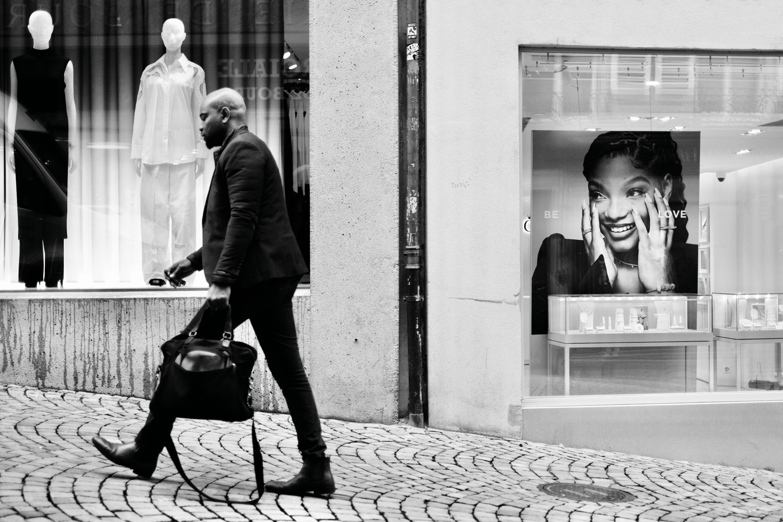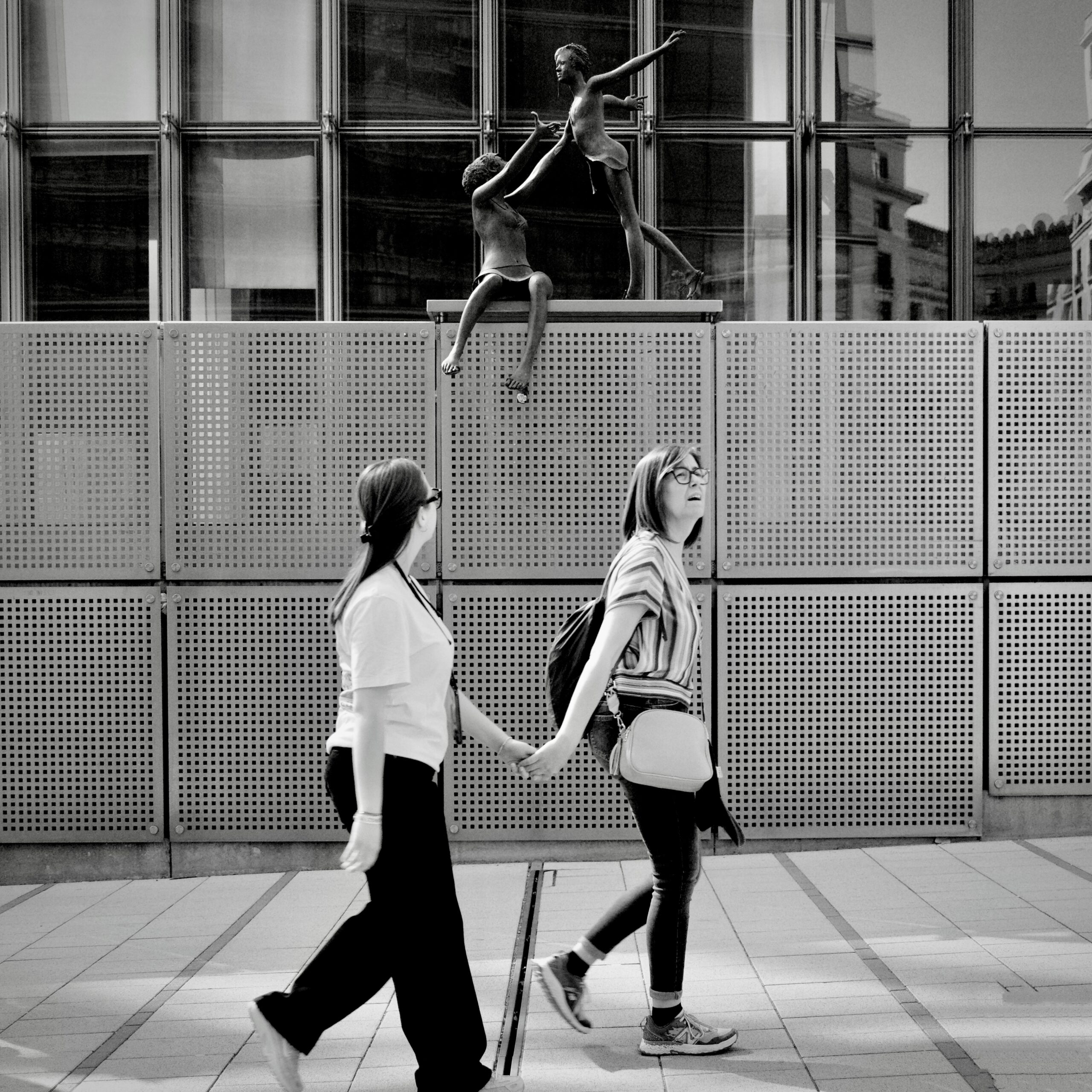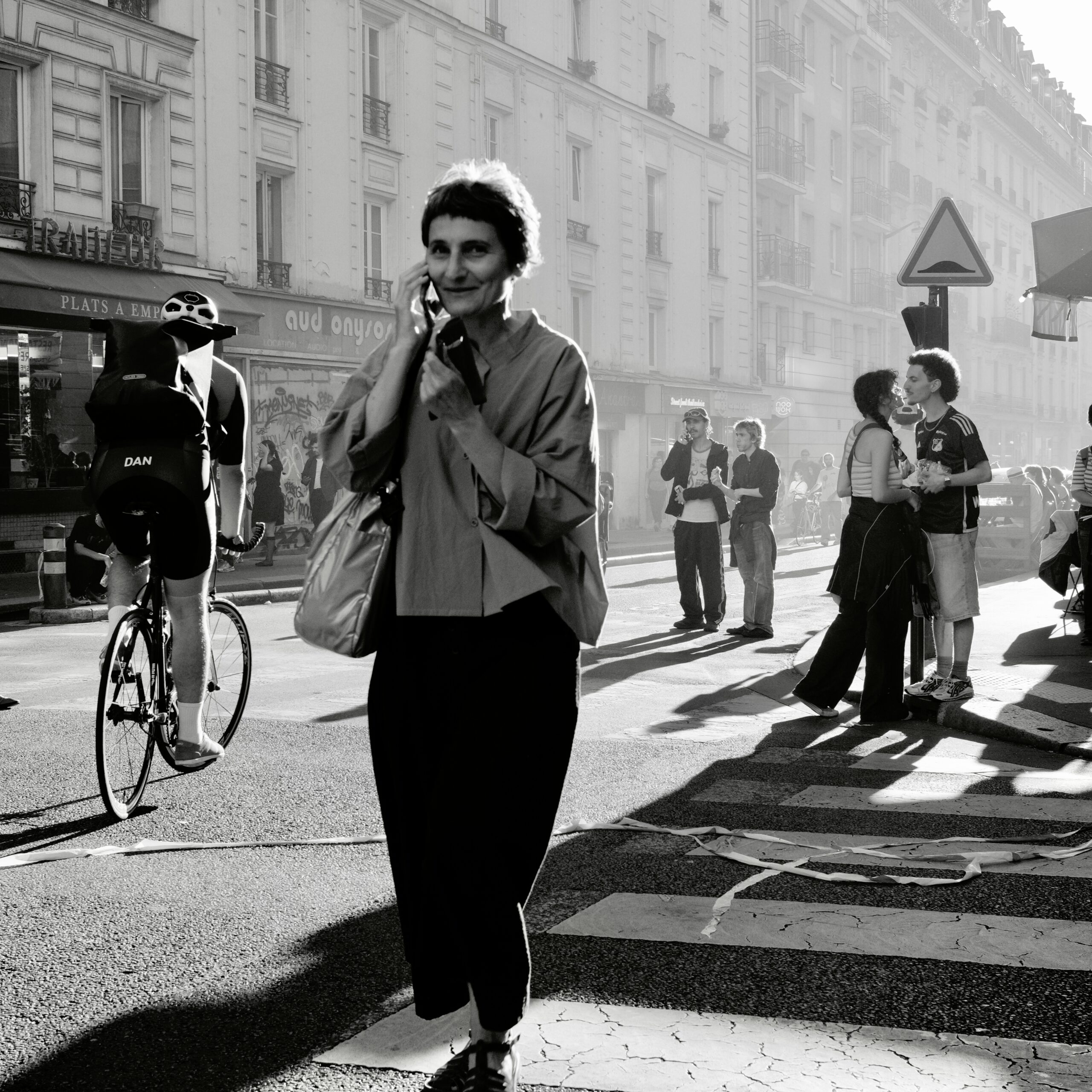 Ma pratique de la photo s’est ensuite naturellement prolongée dans la rue, où l’imprévu dicte désormais directement le sens né de l’addition d’un sujet et de son arrière-plan. Je cherche à y repérer toute association intéressante entre les personnes qui croisent mon objectif – personnes qui deviennent instantanément des personnages – et un élément du décor urbain qui les entoure. Ainsi naissent autant d’histoires visuelles interpellantes ou simplement émouvantes. Et si j’y glisse souvent une touche d’humour, de malice, voire une pointe de cynisme, c’est toujours avec bienveillance. J’aime les gens et le contact.